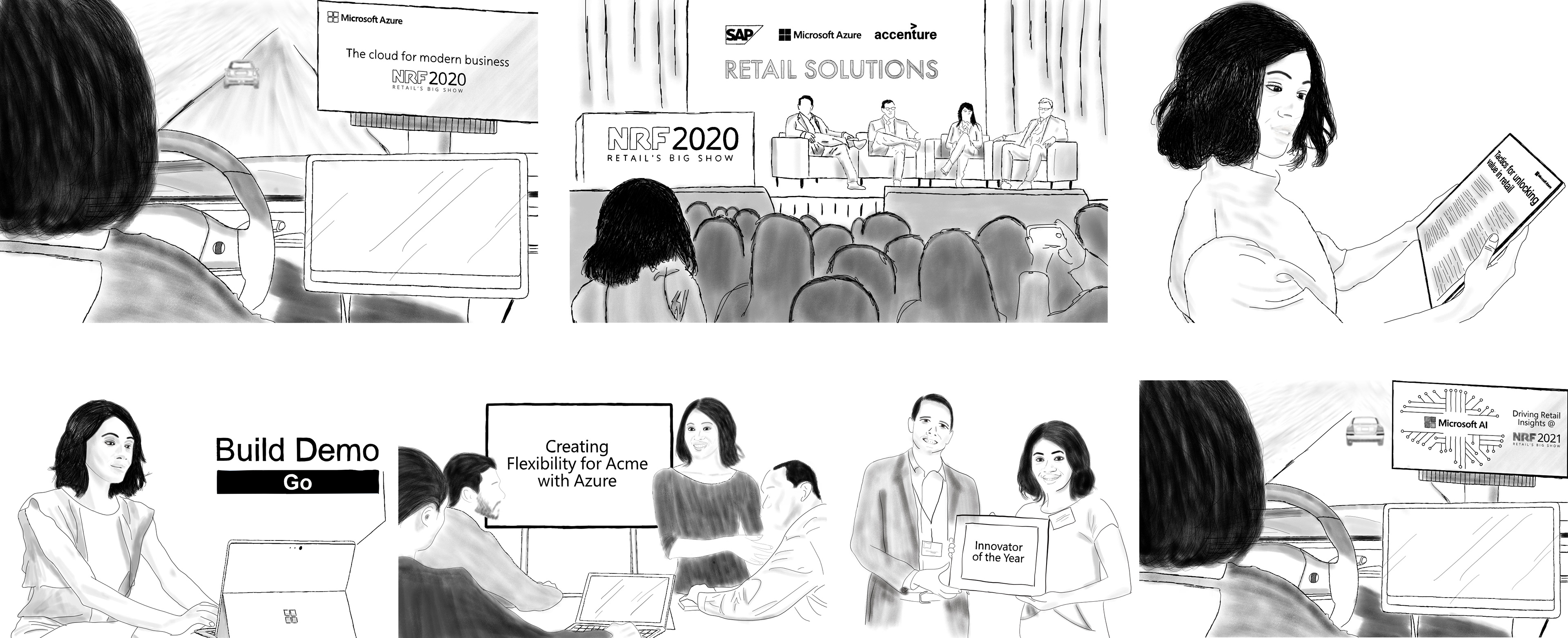 Hand-drawn artboards illustrating a customer journey scenario.